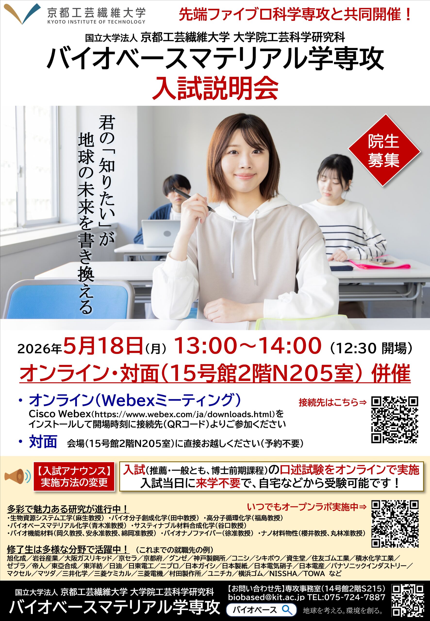 「バイオベースマテリアル学専攻 入試説明会」を先端ファイブロ科学専攻(https://www.fibro.kit.ac.jp/)と共同開催します。